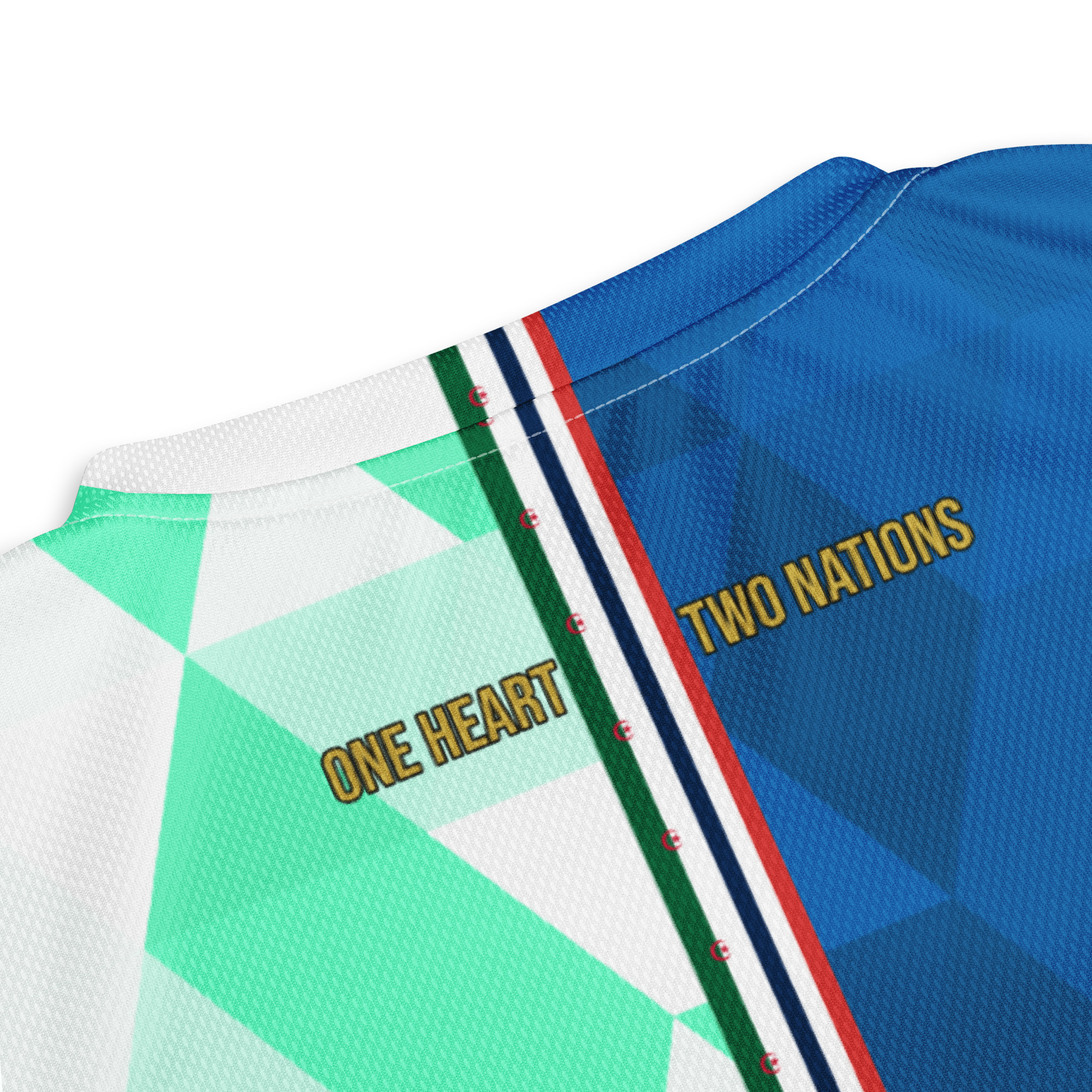 Le maillot France Algérie Dual Nation est conçu pour les supporters ayant une double nationalité ou une double culture entre la France et l’Algérie. Ce maillot de football unique mélange les couleurs emblématiques des deux nations pour représenter fièrement les binationaux.